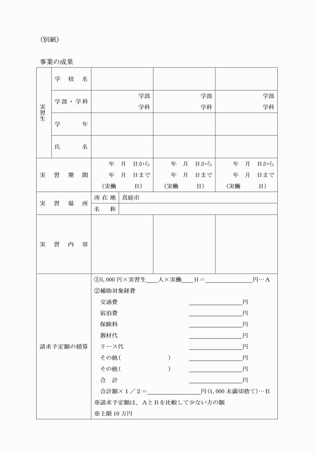 第6条 補助金の額は、実習生1人につき1日当たり5,000円に受入日数を乗じて得た額と補助対象経費に2分の1を乗じて得た額(1,000円未満の端数があるときは、その端数金額を切り捨てる。)を比較していずれか少ない方の額とする。ただし、1補助対象者につき1年度当たり10万円を限度とする。