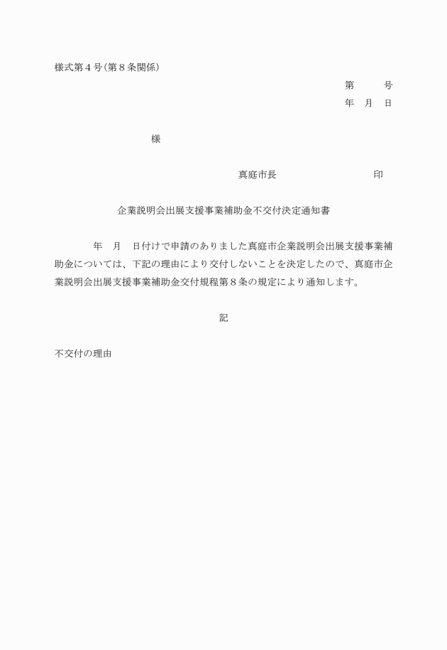 第7条 補助金の交付を受けようとする者(以下「申請者」という。)は、補助事業の開始の10日前までに企業説明会出展支援事業補助金交付申請書(様式第1号)に次に掲げる書類を添えて、市長に提出しなければならない。