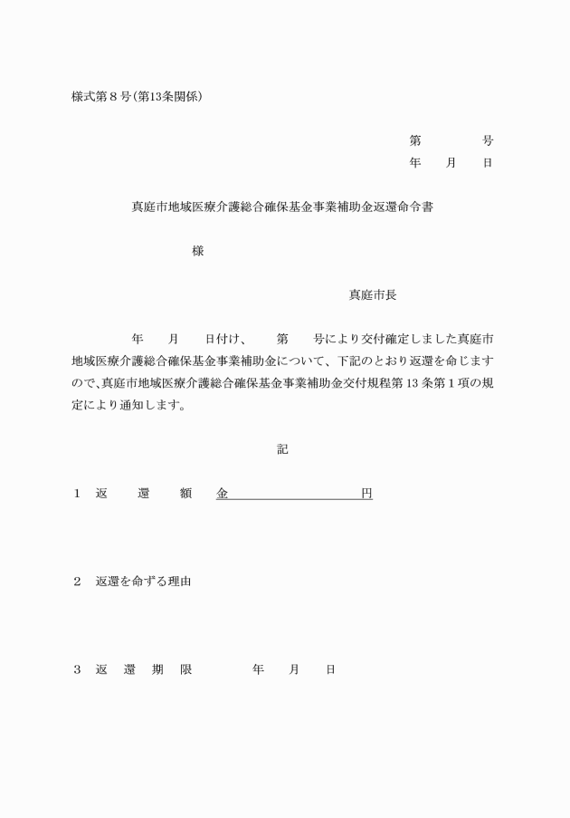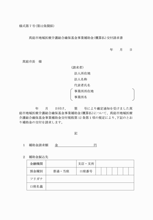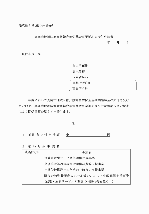 第6条 補助金の交付を受けようとする者(以下「申請者」という。)は、真庭市地域医療介護総合確保基金事業補助金交付申請書(様式第1号)に関係書類を添えて、市長に提出しなければならない。