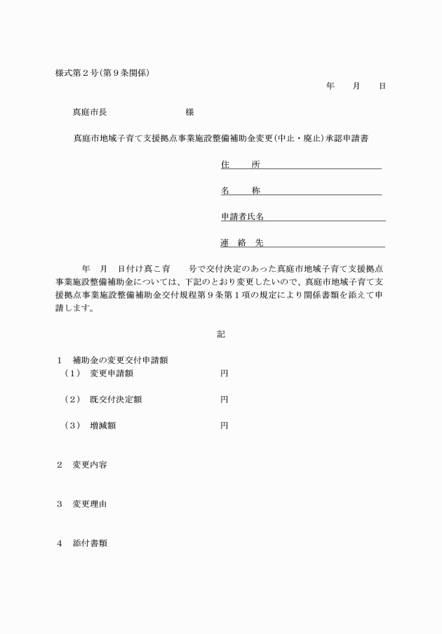 第10条 補助事業者は、事業が完了したときには、速やかに真庭市地域子育て支援拠点事業施設整備補助金実績報告書(様式第4号)に、次に掲げる書類を添付して、市長が別に定める期日までに報告しなければならない。