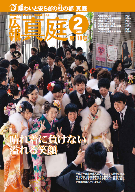 [表紙の説明] 平成27年真庭市成人式。久しぶりに再会した友だち同士で記念撮影をする新成人。会場ではこのような光景があちこちで見られ、新成人誰もに笑顔が溢れていました。