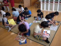 はじめに,絵本の読み聞かせや紙芝居をしていただきました。子どもたちは物語の世界にどっぷりと入り込み,楽しそうに見入っていました。その後,500冊以上の本を積んだキャラバンカーに入り,それぞれが読みたい本を手にとって,読書を楽しみました。講談社の方をはじめ,読み聞かせボランティアの皆さんには大変お世話になりました。また,ご家族の方3名も参加してくださいました。ありがとうございました。