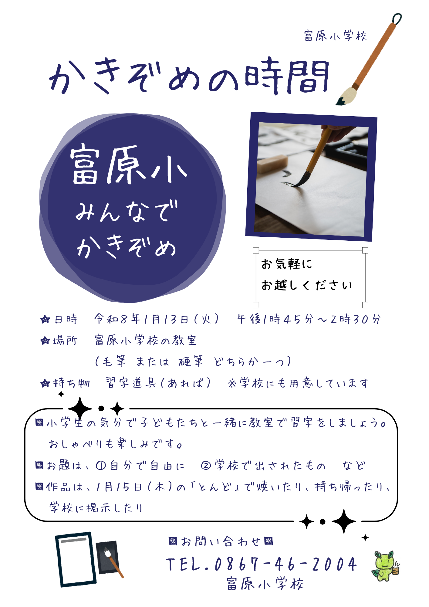 1月13日 火曜日に 子どもたちと一緒に書き初めをしませんか?1月15日 木曜日に「とんど」もします。お友達などと一緒にお越しください。